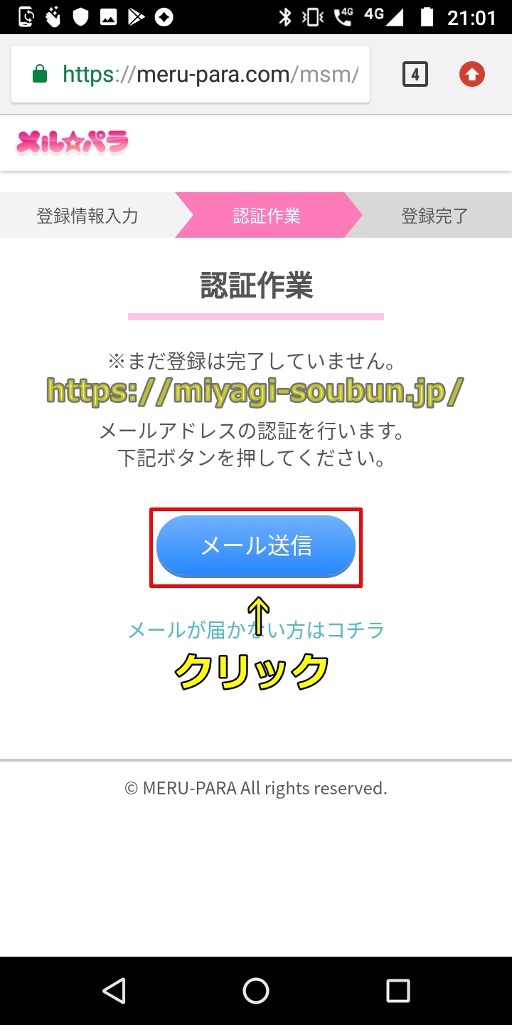 電話を切ったらメルパラの登録画面に戻り、【登録する】をクリックしてください。